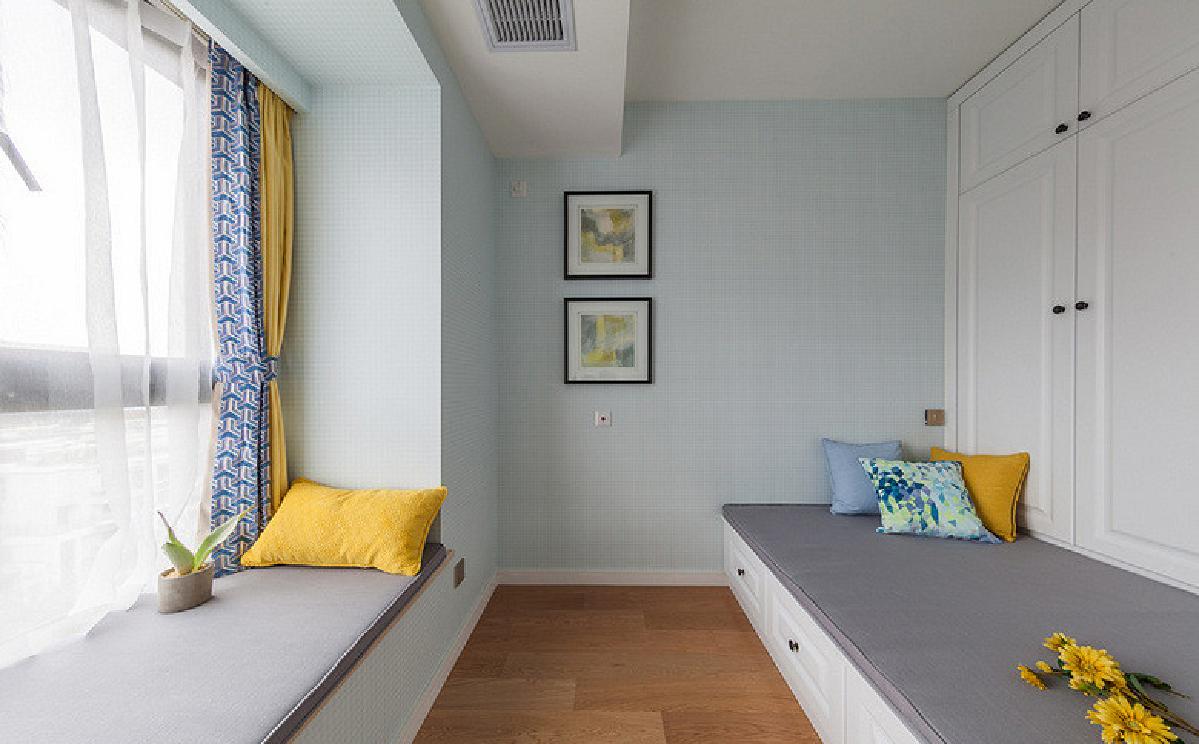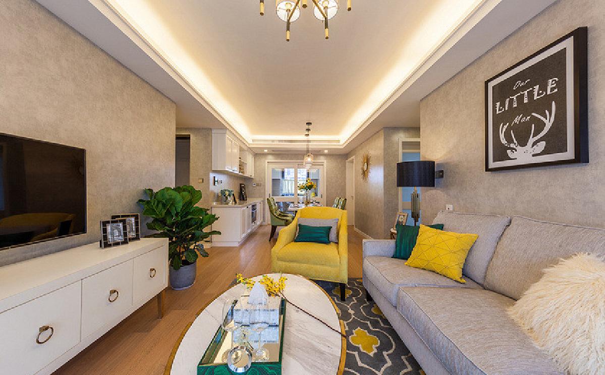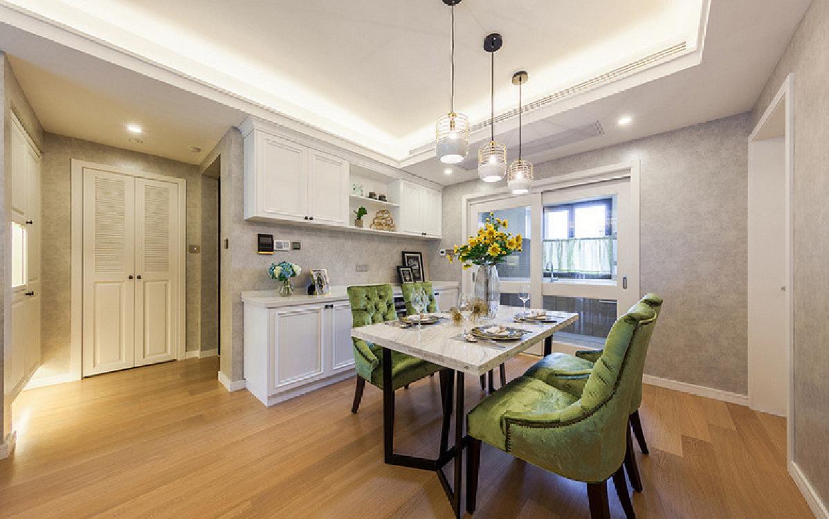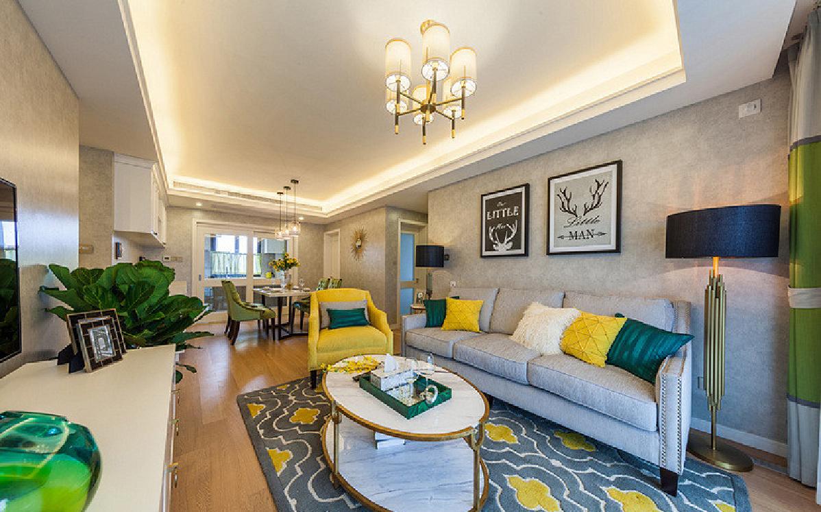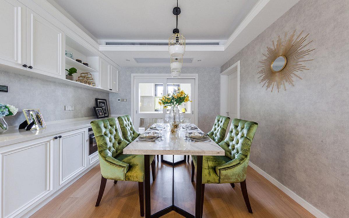 美式混搭风格设计的三居室,客厅与玄关处采用靓丽的青绿色装饰墙壁清新舒畅。