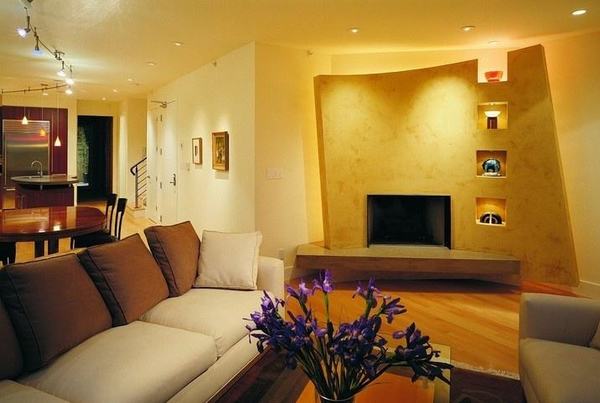 选择了这个位置设计电视背景墙也是比较特别的,沙发的摆放也是竖着摆放的。而是根据户型局限设于侧面,圆弧的独立墙面,掩盖了墙角处的尴尬,墙体涂刷成了带有纹理的温馨黄色,而电视墙上的几个镂空搁架,美丽地展示着别致的装饰品。