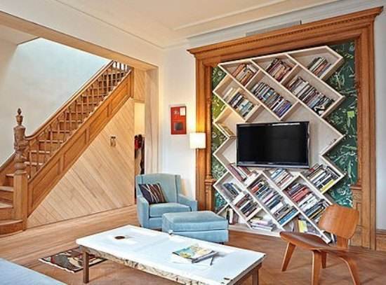 客厅这个电视背景墙的设计非常有个性也有很强的实用性,在兼顾收纳的同时,外观上也毫不逊色。倾斜的设计,让书架极具造型,由于中间的隔板,不用担心书本会掉落,而书架上的彩色的书籍瞬间成为背景墙中最靓丽的颜色。