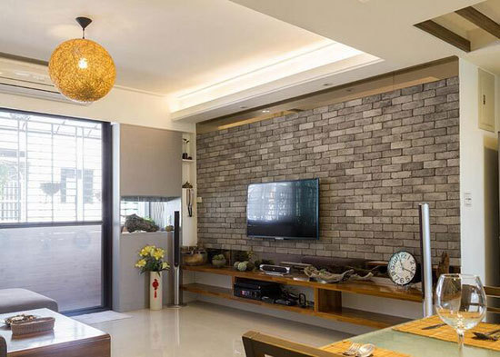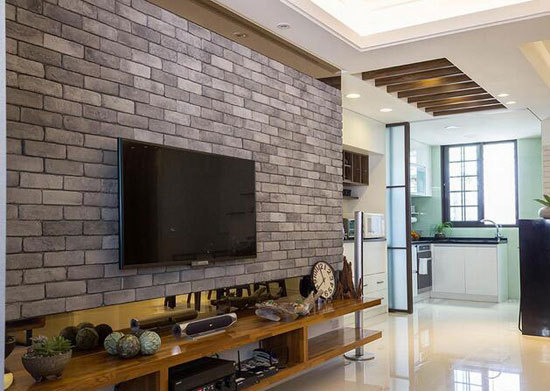 以文化石铺陈电视墙体,呼应工业风色彩,上下两侧则以茶镜拼贴,让视觉更显延伸。