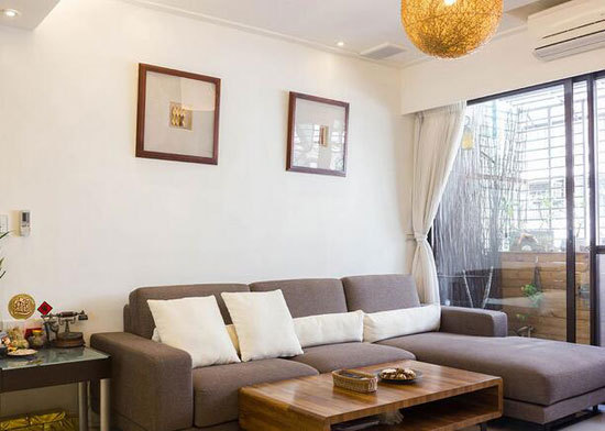 落地窗透出阳台的花园意境,室内以竹编灯饰、木作茶几与朴实意象的画作搭佐下,藉由自然元素串连起内外空间。