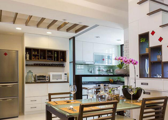 厨房出口特别设计一道玻璃拉门,在烹调时阖上,得以阻隔油烟四溢带来的困扰。