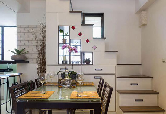 室内大量的收纳机能隐藏于楼梯设计中,中央特别以凿空结构体,将后方窗台的光源引入室内。