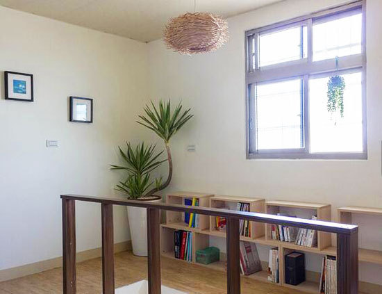一楼至二楼的转折空间成为书房,绿意植栽与木作元素的点缀,呈现自然与惬意的气息。