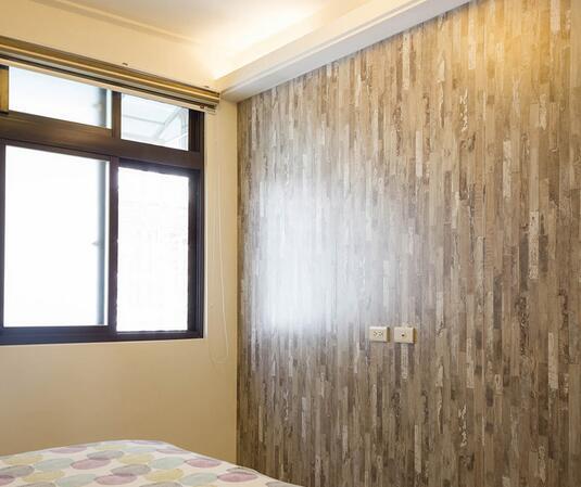 三大块复古风色彩的系统板拼出一整面电视墙体,深浅不同的木纹色彩与质地呈现,营造出朴实且粗犷的美丽肌理。
