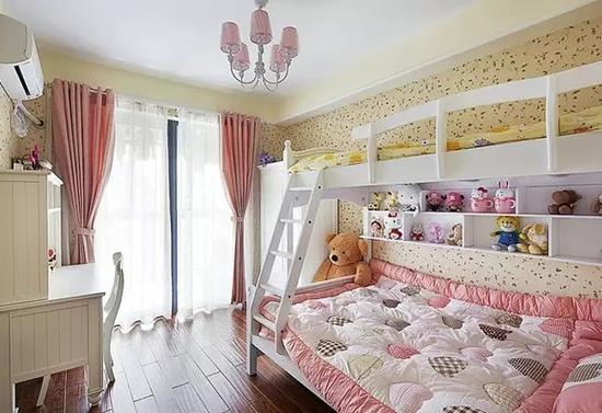 床品配上有着红白格子或粉色花朵的被子和床罩,摆上一个粉色的娃娃、可爱的兔子和泰迪熊或者毛绒绒的公仔,用各种轻柔甜蜜的色彩一起为小公主卧室的的甜蜜氛围。和孩子一起挑选她喜欢的动物图案、花草与卡通人物,作为卧室的配饰,小公主一定非常喜爱。