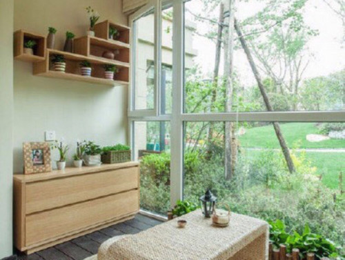 3、装饰阳台要注意整体和谐度,以绿色植物为主题的阳台最好用天然石材或者原木来进行基础装修,尽量避免瓷砖等人工痕迹过重的材料。