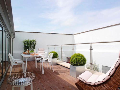 5、在阳台上摆放花卉、晾晒衣服的前提是做好地面防水,经过防水处理的室外木质铺底材料和防滑地砖都是不错的选择。