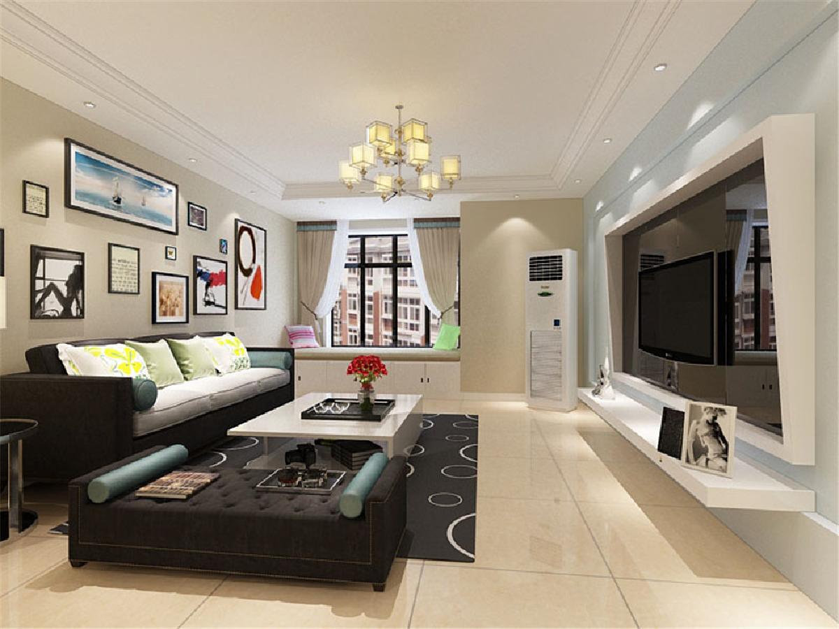 客厅空间讲究的是时尚的现代化气息,电视背景墙采用石膏板流体曲线面造型使墙面更柔和,配合浅蓝色乳胶漆,彰显个性,地面整体通铺米黄色地砖使空间看起来更有时尚感,透着现代化的气息。