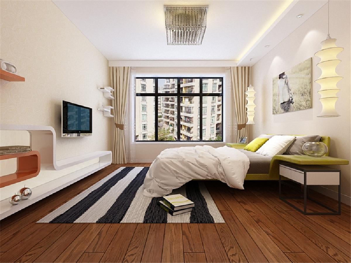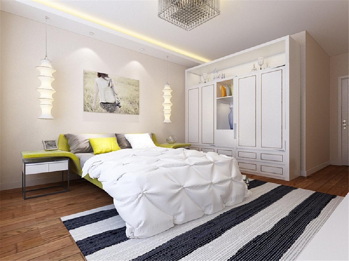 主卧室的空间比较宽敞而且采光相对较好,顶部的一字形灯池起到一定的修饰作用但也不会破坏整体的现代感,整套方案风格统一,实用性与舒适度较强。
