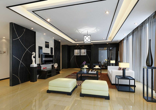 客厅是主人向访客展示最多的地方。客厅颜色应充分体现主人的特点。如:红、黄、紫等色彩。地面采用黑色、深红等色彩,顶部采用金黄色灯饰及光线,搭配华丽堂皇的效果。